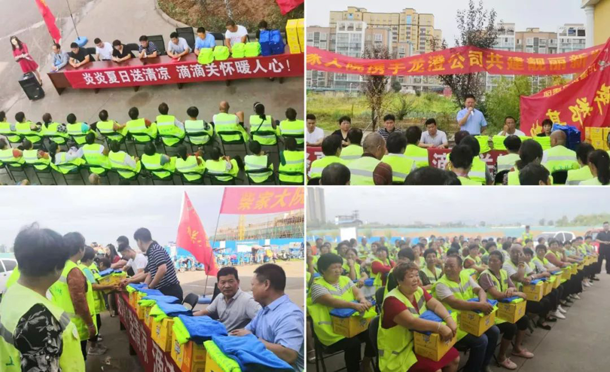炎炎夏日送清凉,滴滴关爱暖人心,7月30日,龙澄新郑项目携手新郑市柴家大院在龙澄新郑基地城关项目部举行为环卫工人送爱心、送清凉活动。捐赠会上,城关乡政府副乡长张建超对龙澄新郑项目的杰出贡献表示充分肯定,并对城关乡的环卫工作提出了新的要求。柴家大院主题文化酒店董事长柴绪文对环卫工人的坚持努力表示赞许,并出资10000余元资助城关项目部的91名一线环卫工人。龙澄新郑基地总经理葛洪学向城关乡政府的鼎力支持和柴家大院的热心关爱表示感谢,并向辛勤工作在一线的龙澄员工表示慰问和感谢。